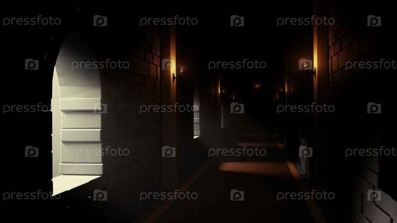 Темный коридор замка с висящими свечами и красной ковровой дорожкой. дизайн. средневековый интерьер крепости или замка