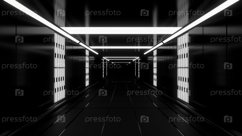 Красно-серый темный коридор с освещением. Дизайн. Просторное помещение в абстракции, которое движется внутрь и украшено различными яркими лучами