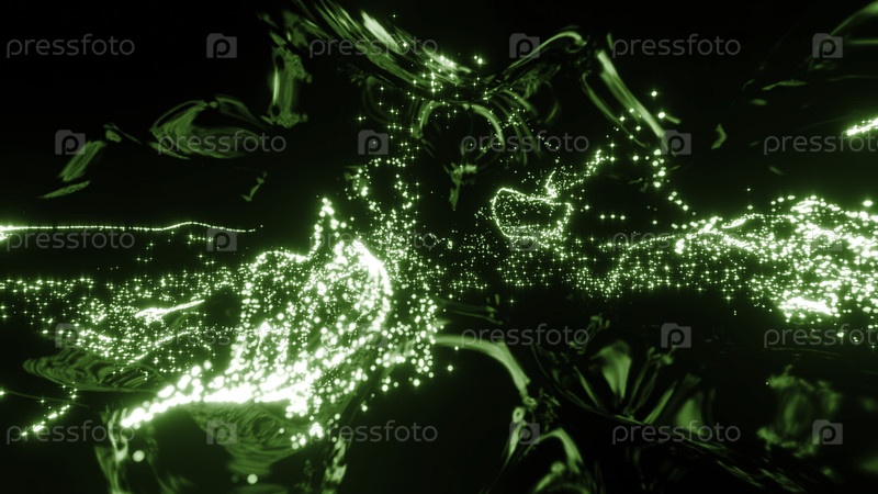 Киберпространство с металлическими линиями и потоками светящихся частиц. Дизайн. Яркие потоки энергетических частиц в виртуальном пространстве. Потоки движущихся световых частиц информации и энергии матрицы