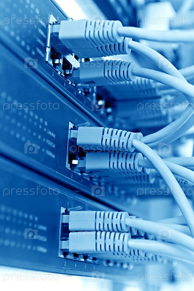 Патч-панель сервера с кабелями, голубой тон
