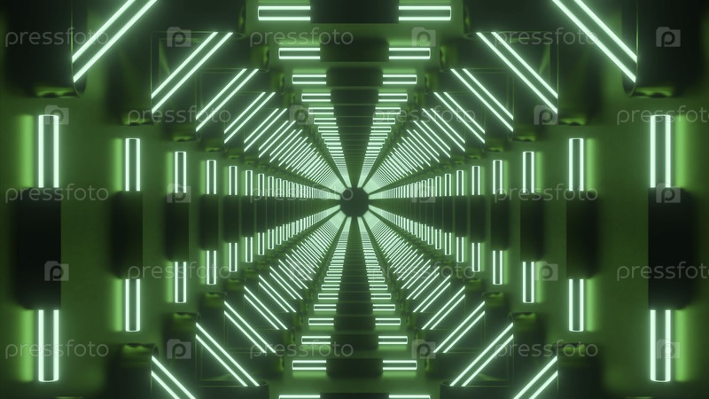 3D зеленый научно-фантастический технологический тоннель, закрывающийся фон движения. Дизайн. Движение внутри сияющего бесконечного научного коридора