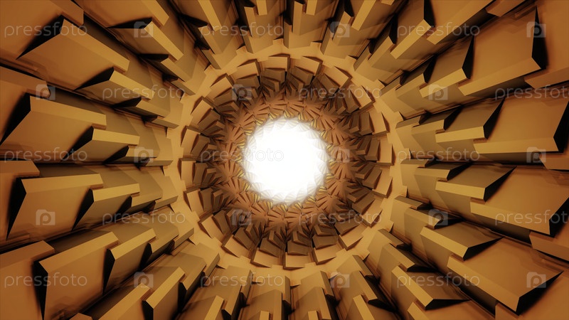 Абстрактный вращающийся яркий туннель с белым светом в центре, бесшовная петля. Анимация. Необычный тоннель оранжевого цвета со спирающимися острыми углами, динамический фон