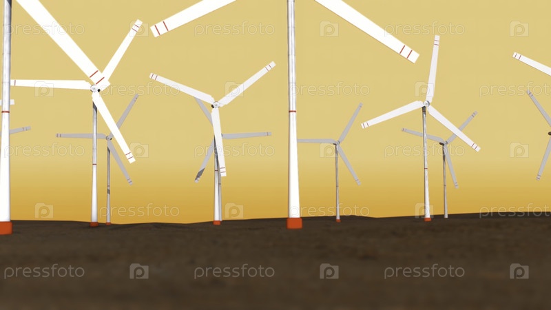 Абстрактный ландшафт с полем, заходящее небо и производство электроэнергии зеленой энергией. Анимация. Ветряные мельницы с вращающимися лопатками на бесконечном поле, концепция чистой энергетики
