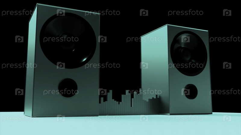 Фиолетовые и бирюзовые динамики. Дизайн. Огромные магнитофоны, играющие музыку с черными басами в анимации
