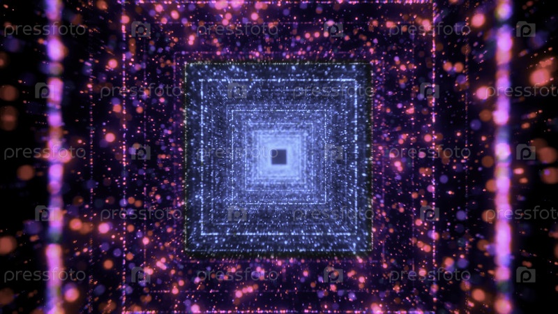 Абстрактный фон с полетом в цифровой туннель мерцающих частиц, бесшовная петля. Движение. Яркие движущиеся квадратные силуэты