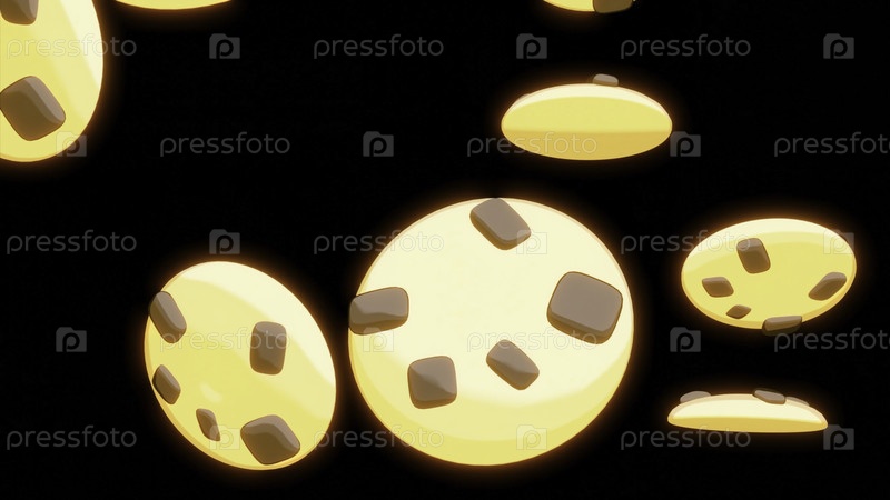 Падающие 3D-бисквиты. дизайн. печенье с шоколадными чипсами на черном фоне. анимация с падающими 3d-бисквитами