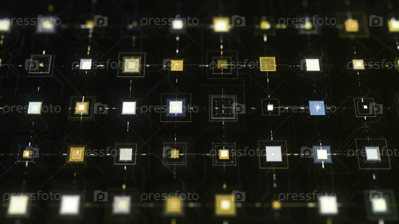 Абстрактные электрические сигналы в электронной схеме.Анимация.Круговая плата и ЦПУ с соединениями и импульсами, технологии и цифровой концепции