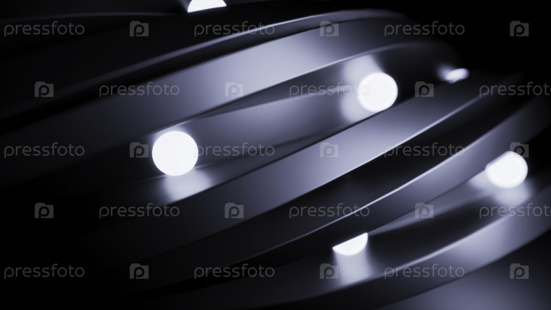 Светящиеся шары движутся вдоль линий. Дизайн. Шары двигаются и освещают складки спиралей. Светящие шары передвигаются по спиральному туннелю