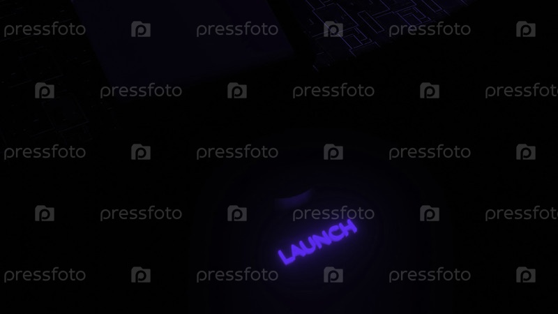 Светящаяся кнопка запуска 3D. Дизайн. Кнопка для загрузки компьютерной системы в темное время суток. Неоновая табличка старта с кнопкой компьютера