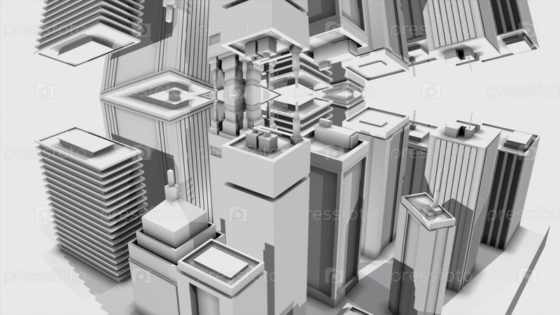 Абстрактная анимация 3D архитектурной модели большого современного центра города на белом фоне.Простая 3D-анимация, сделанная в 4K