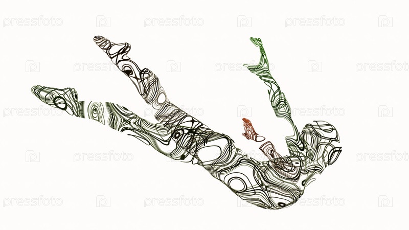 Анимация летающего силуэта женщины из линий. Дизайн. Возникающий анимированный силуэт женщины с красочными линиями. Летающая и вращающаяся фигура женщины, выполненная из линий на белом фоне