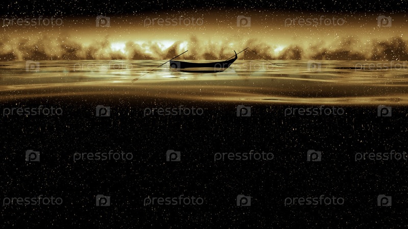 Лодка в Черном море на фоне звезд и облаков. Дизайн. Сказочная 3D-анимация с лодкой в ночном море со светящимся горизонтом. Волшебная анимация с лодкой в море в звёздной ночью