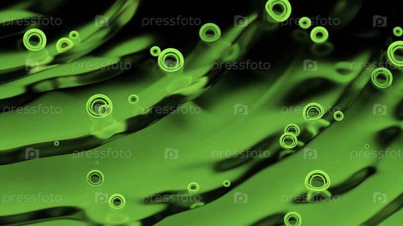 Неоновые пузыри движутся плавая на жидкости. Дизайн. Двигающиеся пузырьки на поверхности абстрактной жидкости. Анимация с двигающимися пузырями на поверхности жидкости с волнами