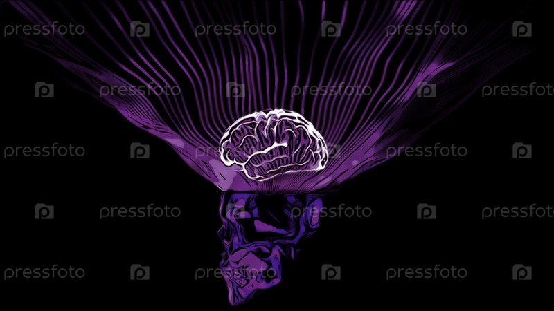 3D-череп с мозговым освещением Дизайн Яркий неоновый мозг со светом на черном фоне Неоновая анимация черепа с мозгом