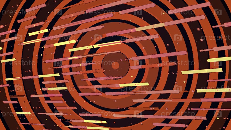 Красный фон.Движение.Большие черные круги в анимации, на которых летают желтые и красные прямоугольники.Высокое качество 4k кадров