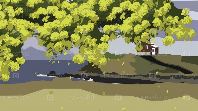Абстрактная анимация пейзажа с желтым деревом. мультфильм-анимация цветущих желтых цветов деревьев, опускающихся в дождь ветром на фоне одинокого дома на холме и моря с горами