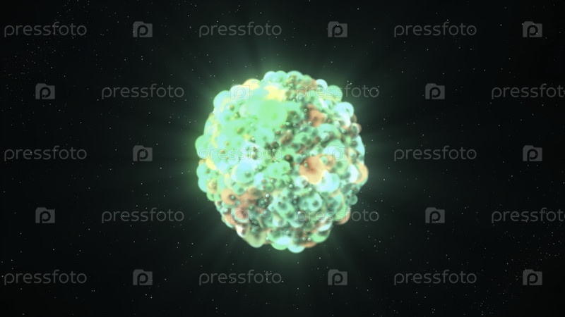 Красочный взрыв частиц, образующих яркий объект. Движение. Космический взрыв цветных плотных частиц. Яркие 3D-частицы формируют густой светлый шар