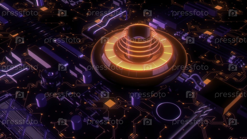 Красивая 3D-анимация материнской платы со световыми сигналами.Движение.Цветовая схема с неоновым освещением и кнопками