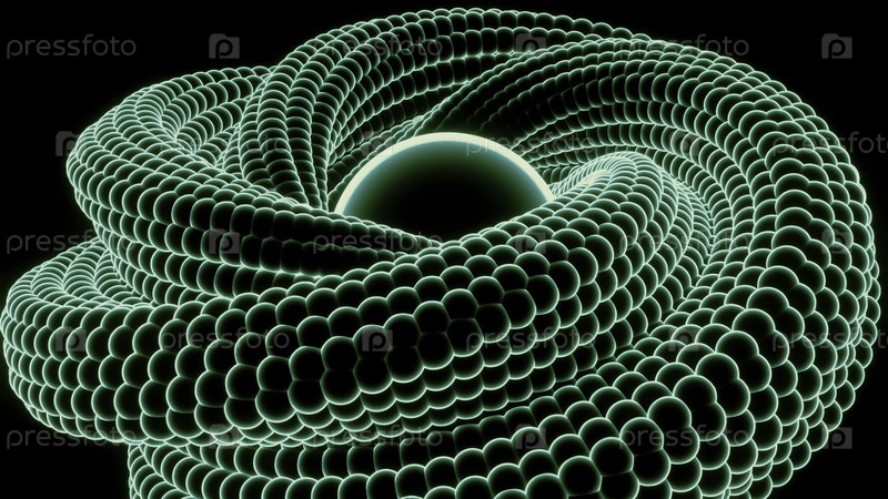 Анимация сфер, собранных в спиральной форме на черном фоне. Дизайн. Красочная фигура с ядром в центре, окруженная изгибающейся 3D-спирали, бесшовный цикл