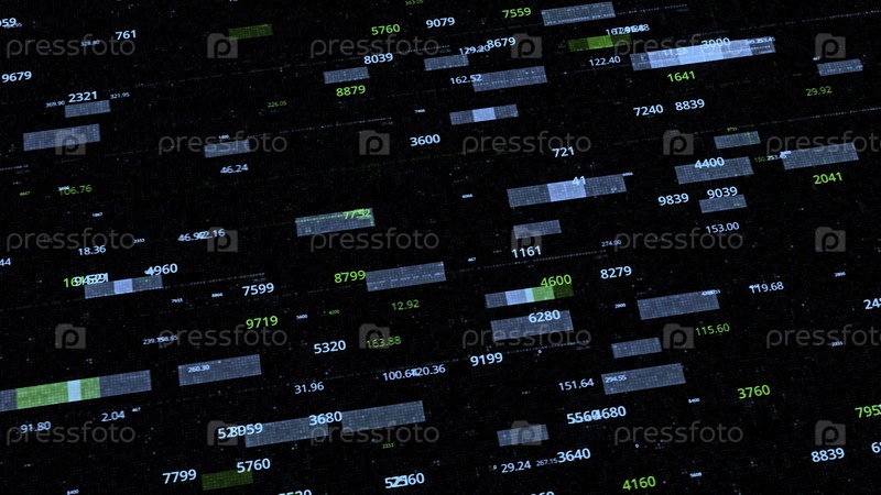 Абстрактные футуристические цифровые зашифрованные данные, дисплей статистического монитора. Анимация. Плавающие синие и зеленые прямоугольники с случайными числами, бесшовная петля