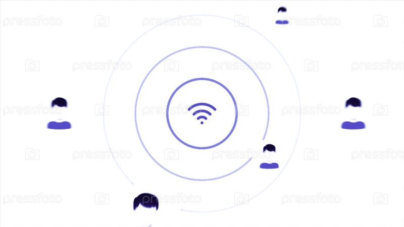 Белый фон.Движение.Концепция распространения Интернета с помощью красно-синих значков Wi-Fi и подключения пользователей видна в анимации.Высокое качество 4k видео