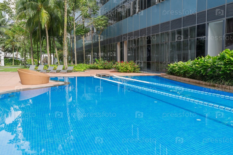 Большой голубой бассейн с дорожкой и уютным креслом на бортике