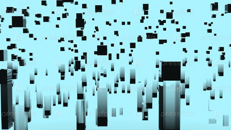 Много кубиков в компьютерном пространстве с отражением. Дизайн. Кубики поднимаются по потоку на изолированном фоне. Множество черных кубов движутся и отражаются в параллельном мире