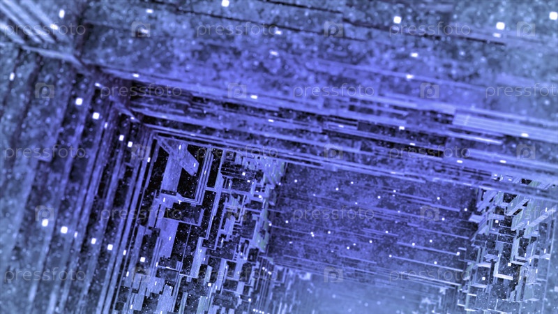 Абстрактные фрактальные 3D синие блоки летают и становятся сложными конструкциями.Движение.Полет внутри абстрактной вселенной