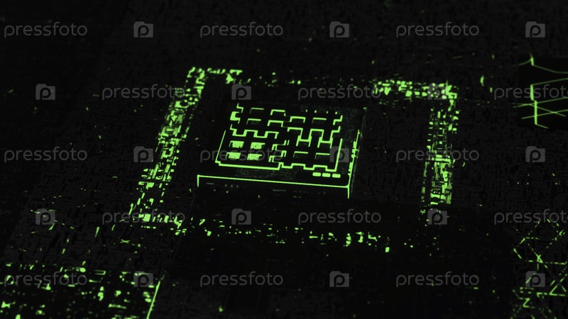 Процессор или микрочип и электронные сигналы на схеме материнской платы, 3D-графики движения. анимация. футуристическая плата с двигающимися электронами с центральным процессором
