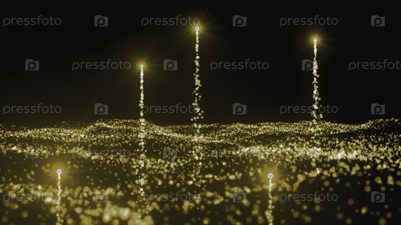 Светящиеся звезды поднимаются в потоке частиц. Движение. Волшебные светящиеся частицы возникают из волнообразного потока. Красивые восходящие звезды в ярком потоке точек