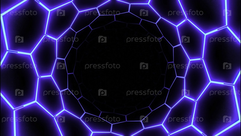 Темный виртуальный туннель с неоновой шестиугольной сеткой. Дизайн. Яркая неоновая решетка шестигранников в круговом тоннеле. Круглый туннель с шестиугольной сетью на черном фоне