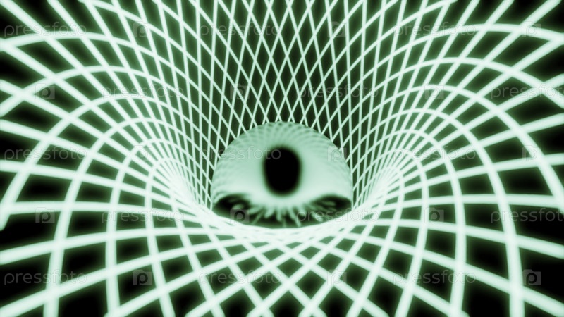Абстрактный полосатый туннель неонового зеленого тоннеля.Дизайн.Светящаяся отражающая сфера внутри 3D-коридора