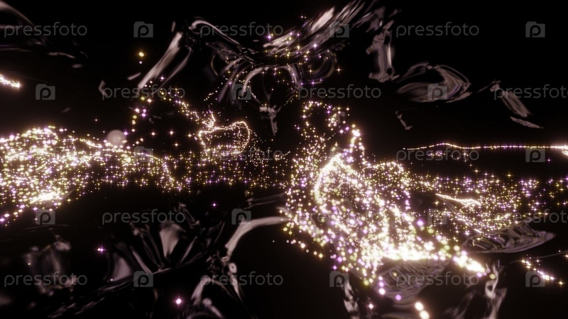 Абстрактный фон с движущимися мерцающими частицами.Дизайн.Красные изогнутые трубки с двумя светящимися частицами