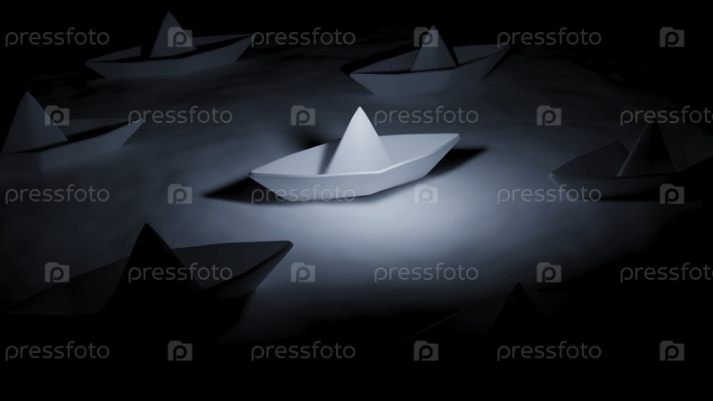 3D бумажные лодки.Дизайн.Бумажные лодки стоят в воде во тьме.3D бумажные лодки на поверхности воды в темноте