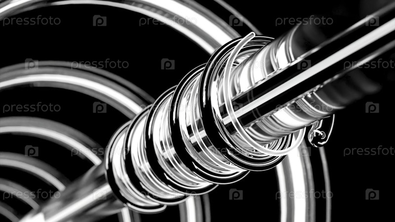 Светящиеся линии вращаются вокруг трубы. Дизайн. Металлическая труба с движущимися спиралями неоновых и металлических труб. Механическая часть с движущимися частями и вращающимися неонными трубами