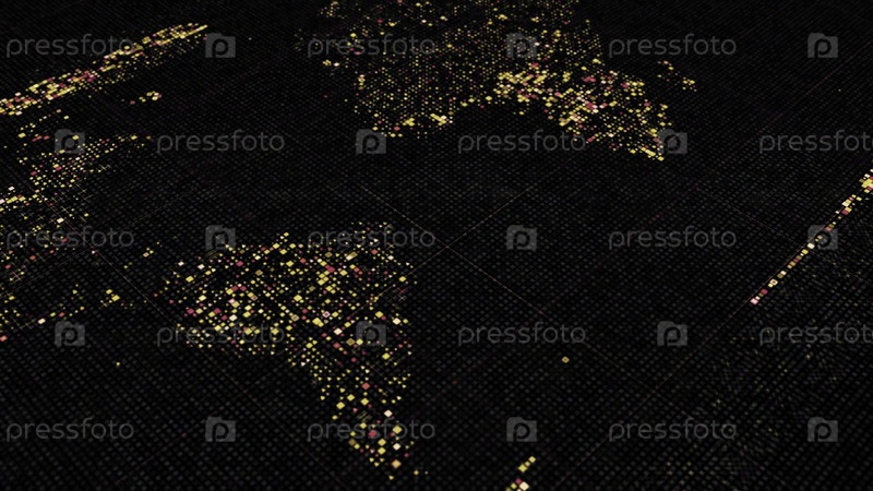 Абстрактная анимация карты мира на цифровом экране, сформированном крошечными фигурами. Анимация. Цифровой экран со континентами, медленно протекающими на черном фоне, плавный цикл
