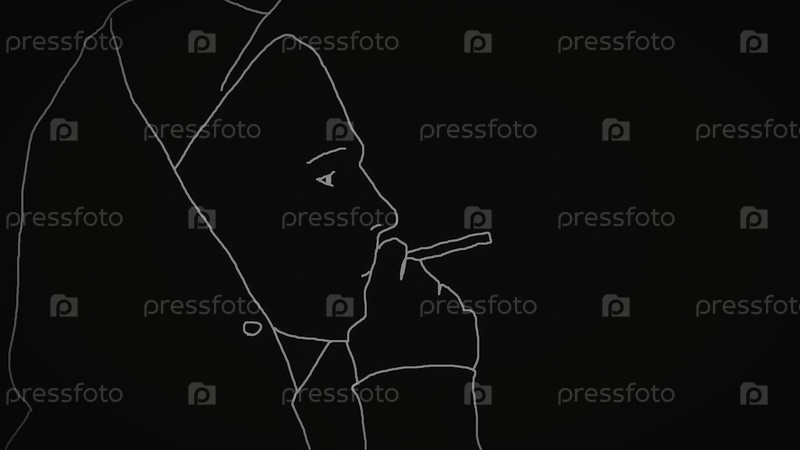 Ближе к черному контуру мужчина в капюшоне и шапке, курящий сигарету на белом фоне.Профильный вид силуэта подростка, курящего сигареты на белом фоне