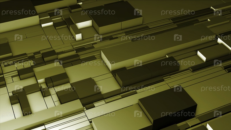 Абстрактная визуализация многих контейнеров разных размеров.Движение.Золотые и серебряные медленно движущиеся коробки