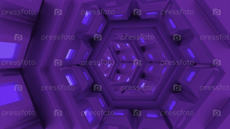 Футуристический технический тоннель. Дизайн. 3D-туннель с элементами футуристического космического корабля. Движущийся туннель с кольцами и космическими деталями