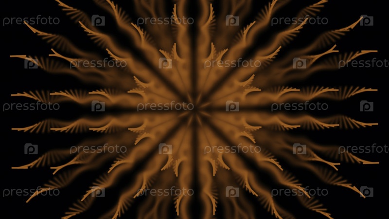 Абстрактный геометрический калейдоскопический рисунок на черном фоне. Анимация. Многоцветная гипнотическая графика движения фона с оранжевыми спиралами с передвигающимися тенями в центральное место