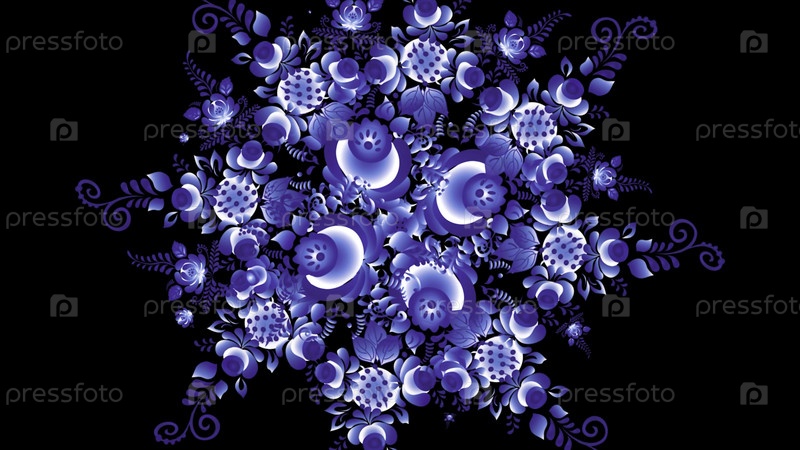 Анимация русской Хохломы.Хохлома Россия ярко-синих цветов на черном фоне