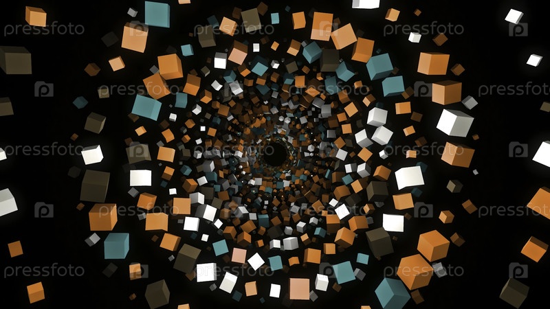 Туннель из 3D цветных квадратов на черном фоне. Анимация. Красивый гипнотический туннель из красочных кубиков. Расстояние от спирали многих ярких кубов
