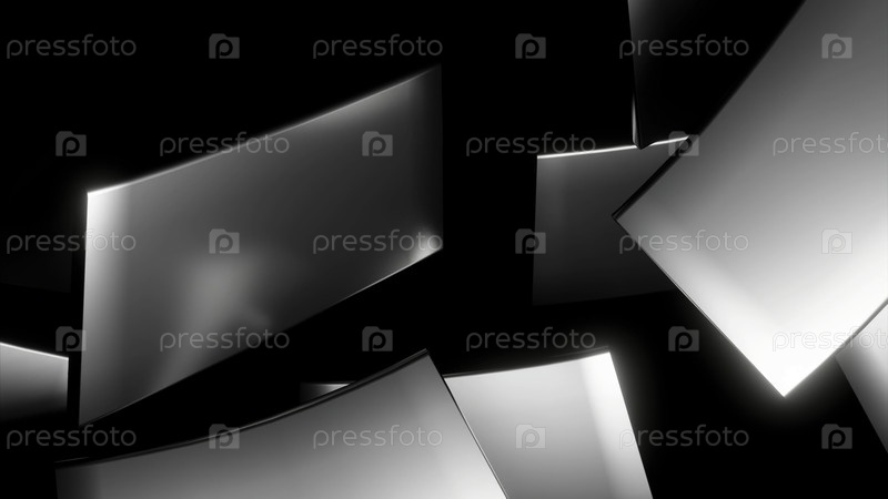 Катание серебряных плиток на черном фоне. Дизайн. Монохромный рисунок с вращающимися серыми плитками