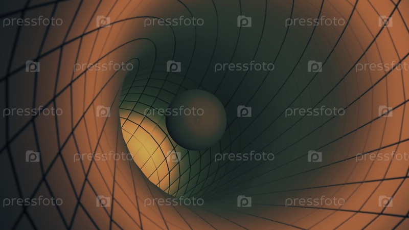 Абстрактная 3D-сцена туннеля с яркими и богатыми цветами, демонстрирующая центральную сферу и сложные рисунки сетки
