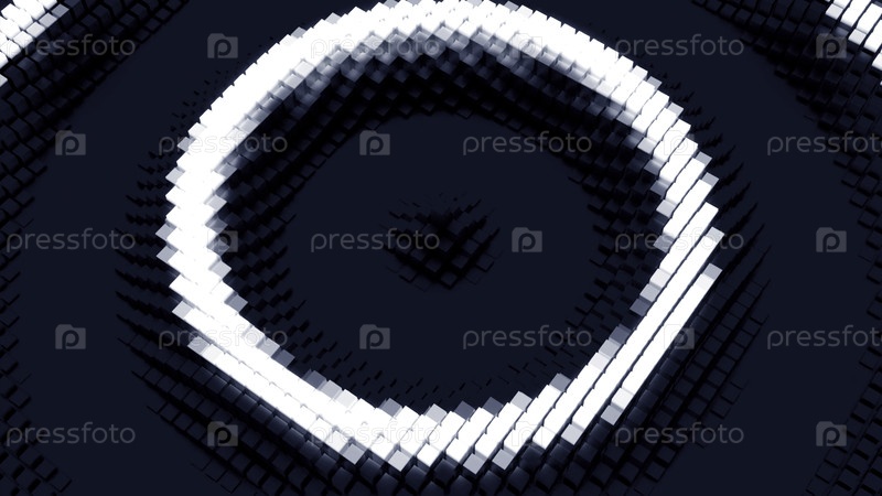 Круговые кольца, движущиеся волнами к центру. Дизайн. Пиксельные 3D-круги перемещаются в волнах на поверхности. Волновые кольца или полоски на поверхности. Обернитесь назад