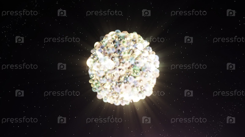 Красочный взрыв частиц, образующих яркий объект. Движение. Космический взрыв цветных плотных частиц. Яркие 3D-частицы формируют густой светлый шар
