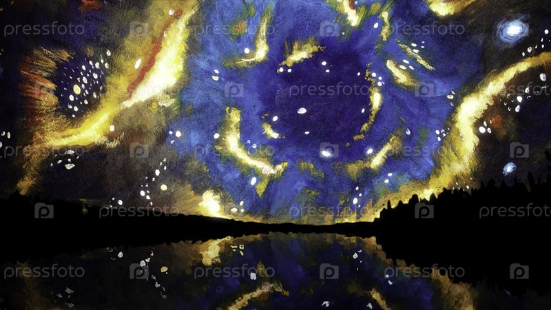 Небо с цветными галактиками. живописная анимация ночного неба в горах с отражением на озере. акварельный эффект красочно мерцающего галактического неба