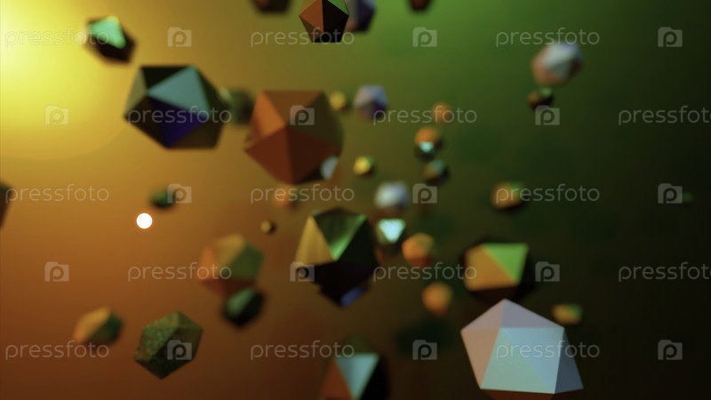 Многоугольные шары случайным образом перемещаются в пространстве. Дизайн. Множество летающих геометрических шариков в красочном пространстве. Хаотический поток летящих многоугольных шаров