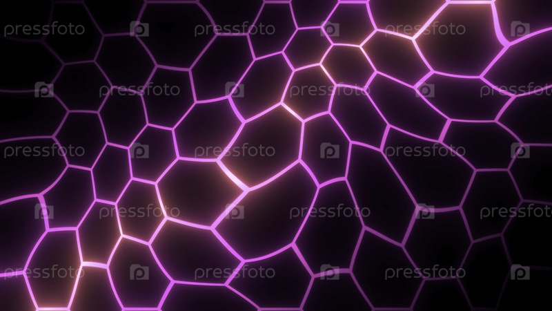 Жидкий рисунок неоновых шестиугольников. Движение. Неонные линии в движущемся рисунке шестиугольников в искаженном пространстве