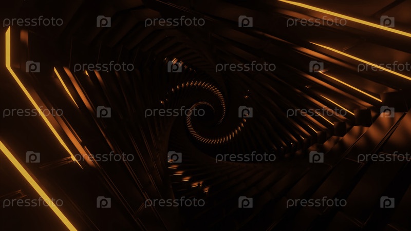 Абстрактный красно-оранжевый тоннель в форме спирали, движущийся быстро и плавно. Дизайн. Бесконечный длинный коридор с темным кругом посередине